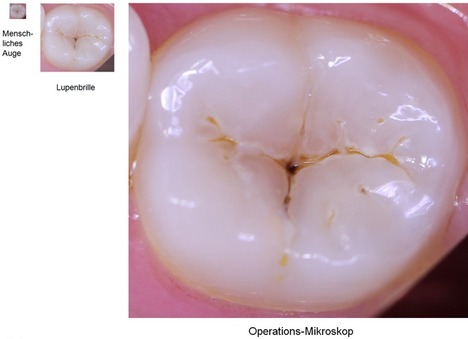 Mit dem Operationsmikroskop wird all das sichtbar. Aber es leistet noch mehr: Was unsere Instrumente tief im Zahninneren bewirken, können wir mit dem Operationsmikroskop im Voraus kalkulieren. Es begleitet jeden Arbeitsschritt „optisch” – vor dem nächsten Schritt erkennen wir das Ergebnis des vorhergegangenen. Die archaisch anmutende Wurzelkanalbehandlung ohne Mikroskop liefert im Gegensatz dazu der / dem behandelnden Zahnärztin / Zahnarzt lediglich einen „ungefähren” Eindruck seines Arbeitserfolges.